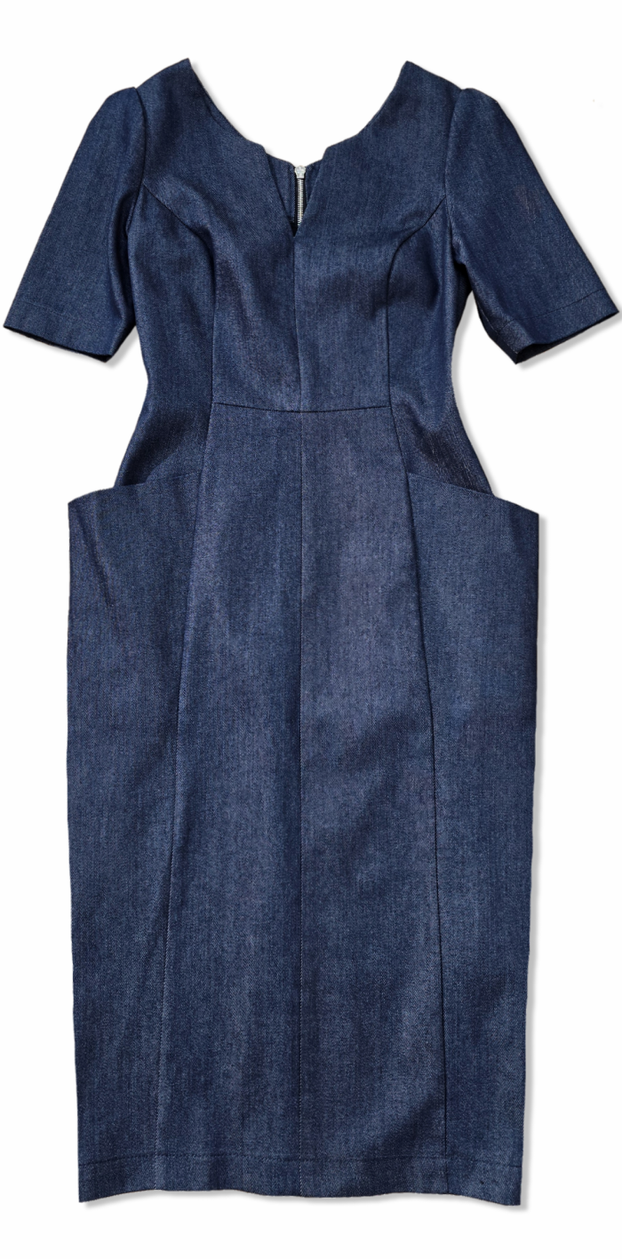 Стильное джинсовое платье в длине миди. Силуэтное, небольшой фонарик с защипом на плече,V- вырез, приталено, стоячие карманы, сзади молния и высокая шлица.